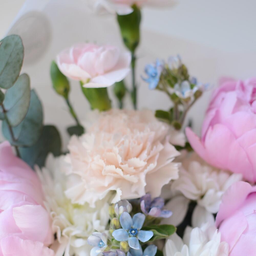 Пион – 3 шт.Оксипеталум – 4 шт.Хризантема кустовая – 1 шт.диантус брют – 2 шт.Диантус кустовой – 1 шт.эвкалипт цинерея пучок – 1 шт.зелень техническая пучок – 1 шт.Упаковка дизайнерская – 1 шт.подкормка для срезанных цветов – 1 шт.Лагурус – 3 шт.