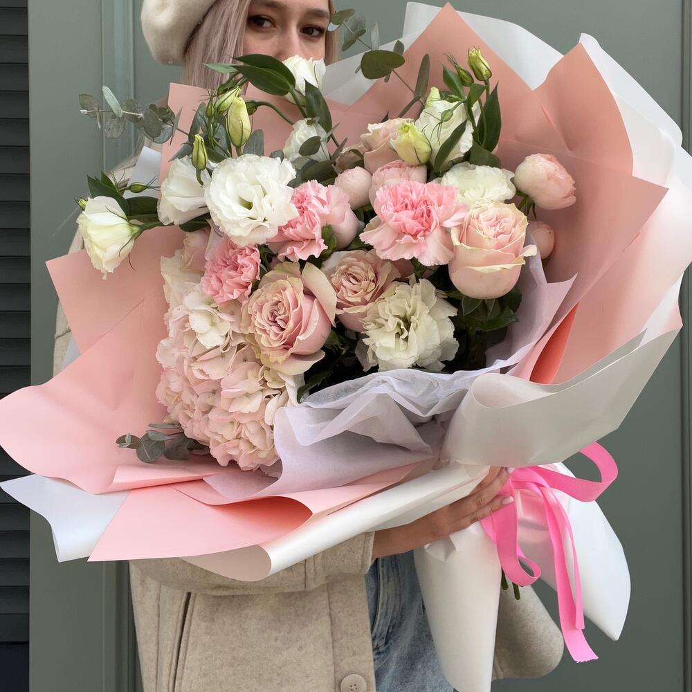 Нежный букет из георгин, пионовидных роз, гвоздик