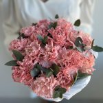 Шляпная коробка с розовой гвоздикой и эвкалиптом, небольшого размера, 20 см в диаметре и 25 см высотой