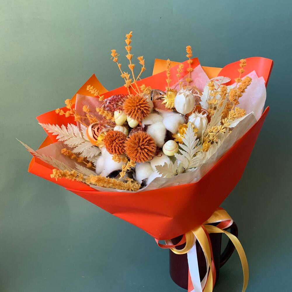 Хлопок (сухоцвет) – 5 шт.Апельсин – 1 шт.апельсиновые дольки – 5 шт.эхинопсис – 5 шт.Нигелла сухоцвет – 3 шт.ракушки лимонные – 5 шт.Гелихризум – 6 шт.папоротник стабилизированный – 1 шт.шандра стабилизированная – 3 шт.нутан сухоцвет – 2 шт.гортензия сухоцвет – 1 шт.Тишью – 1 шт.Пленка матовая – 1 шт.