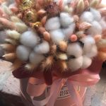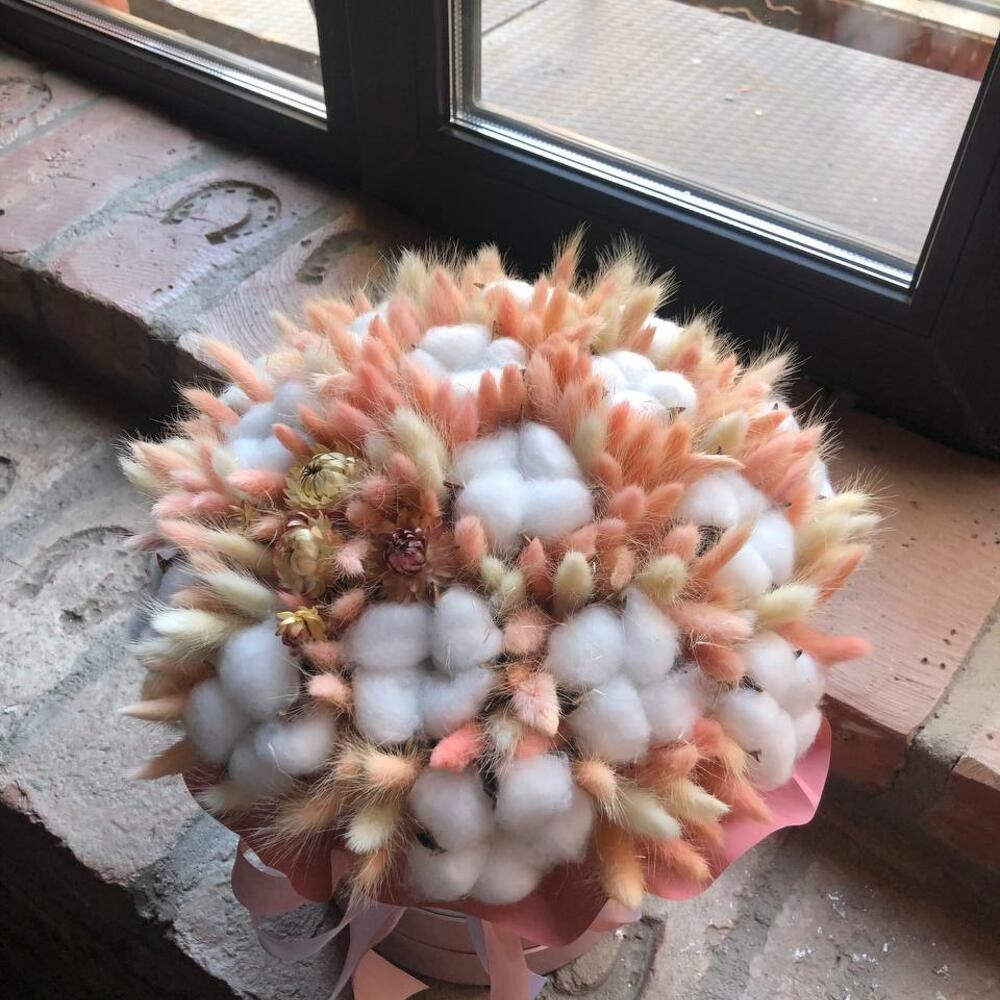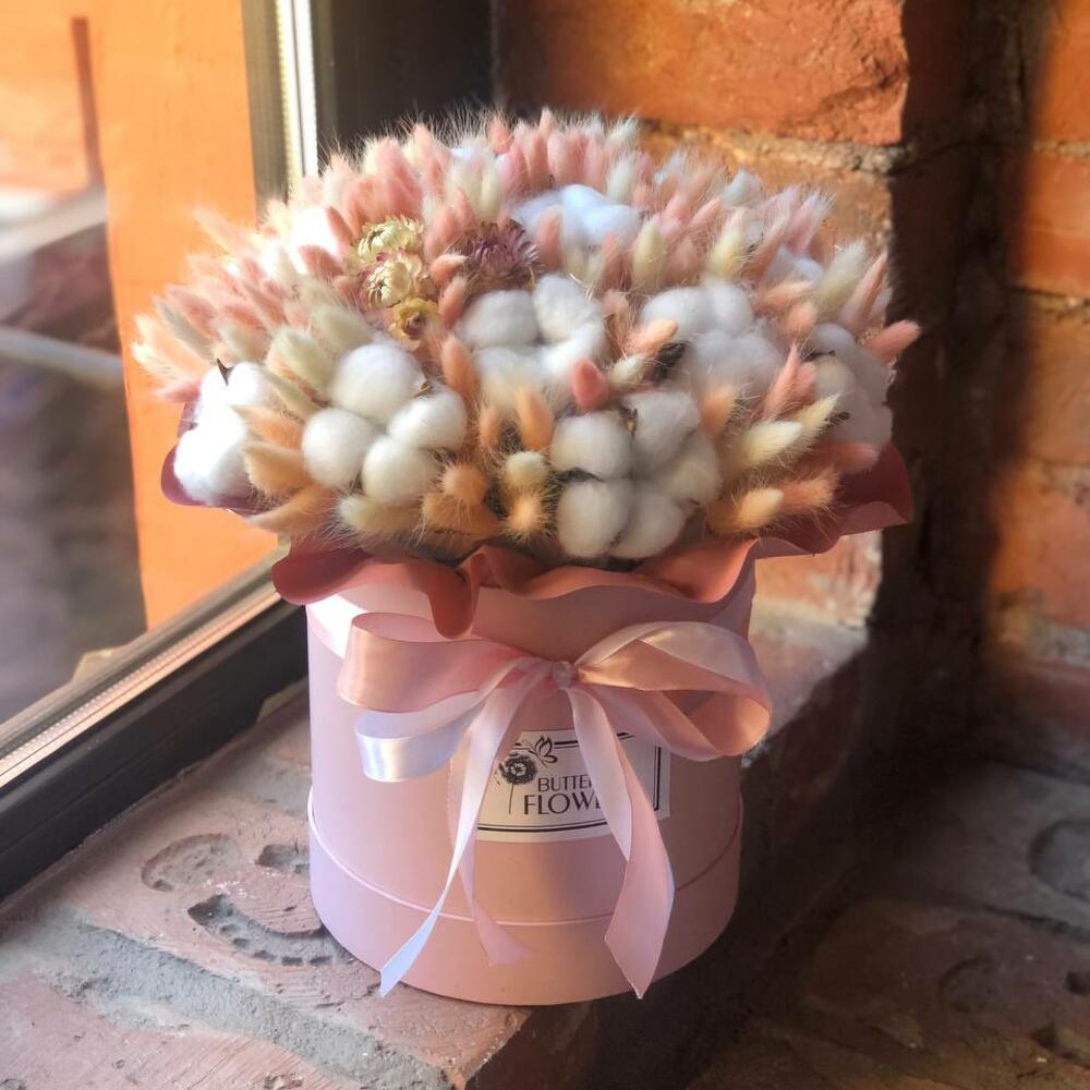 Букет из сухоцветов – лагуруса, хлопка и стабилизированной розы в шляпной коробке «Ирма»