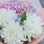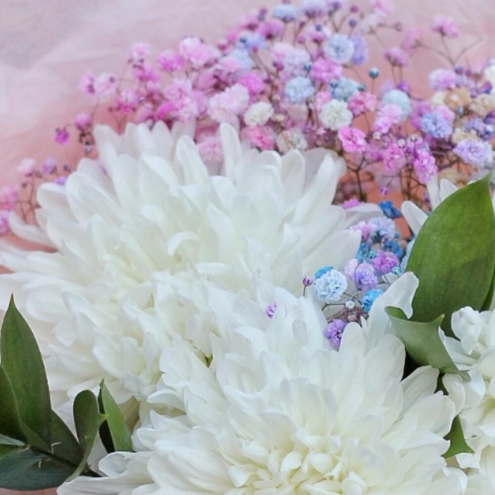 Букет из трёх хризантем и цветной гипсофилы с зеленью