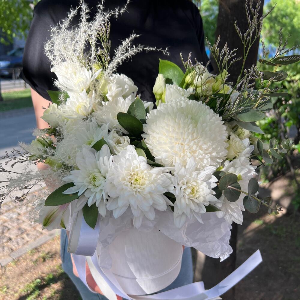 “Сиреневый туман” – композиция из гипсофилы в шляпной коробке