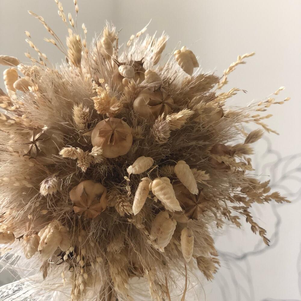 букет сухоцветов микс – 5 шт.Кашпо керамическое – 1 шт.Оазис флористический – 1 шт.гелихризум пучок – 2 шт.Лента Кружево – 2 шт.бриза пучок – 3 шт.