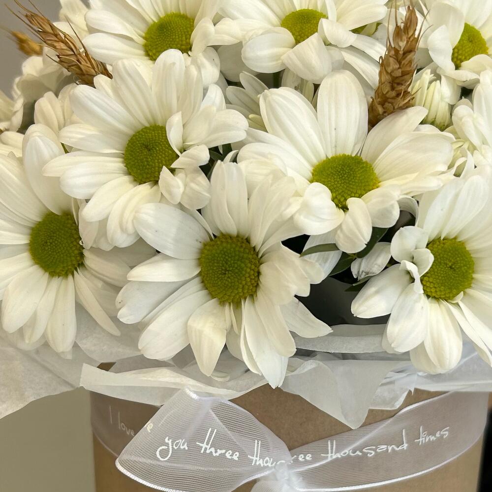 Композиция в коробке из белой кустовой хризантемы и веточек пшеницы