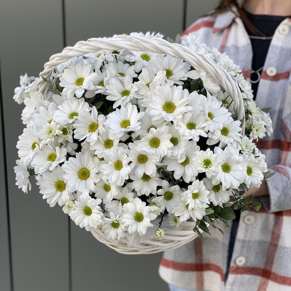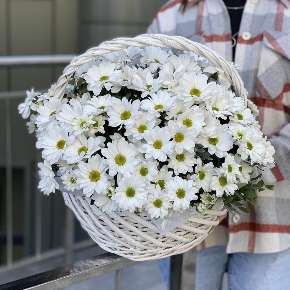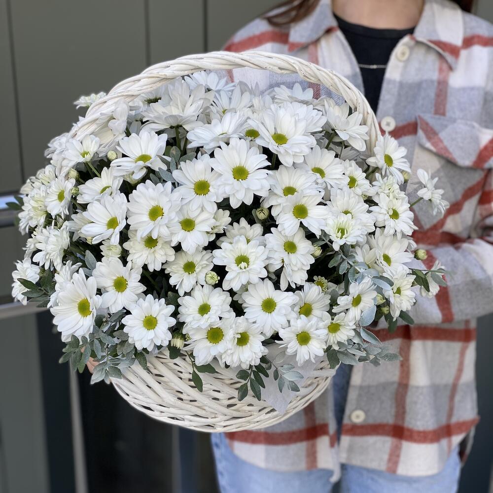 хризантема белая ромашковая – 11 шт. Писташ – 5 шт. Корзина – 1 шт. Оазис – 2 шт. Оформление – 1 шт.