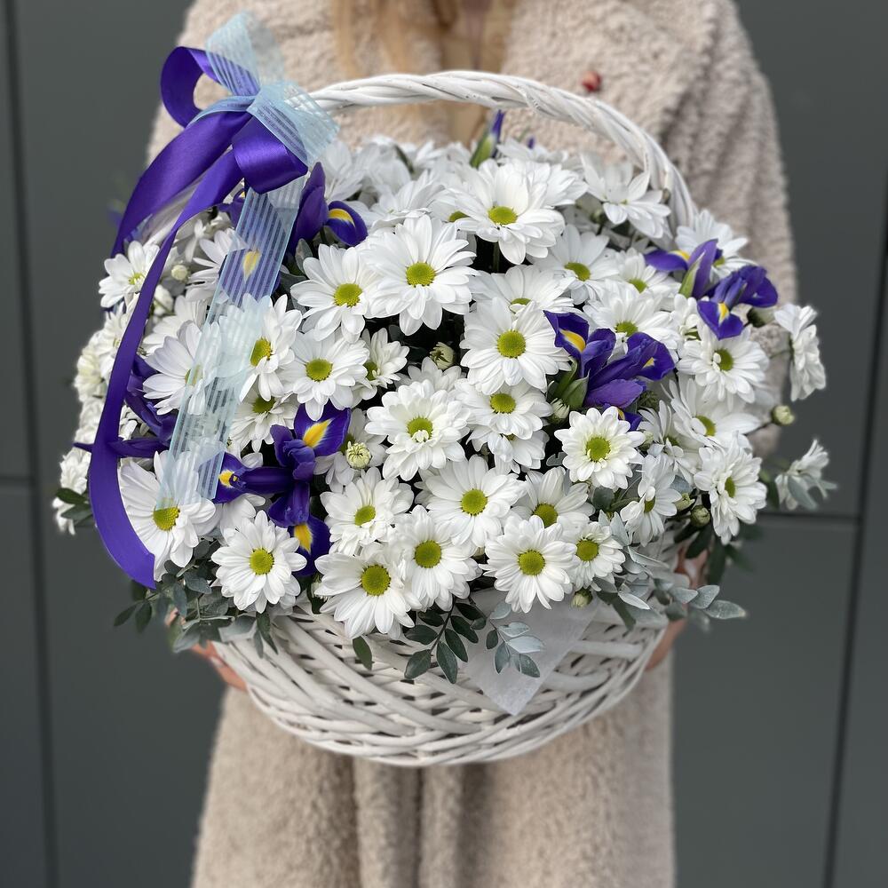Корзина – 1 шт. Писташ – 6 шт. Хризантема – 11 шт. Оазис – 2 шт. Оформление – 1 шт. ирисы – 9 шт.