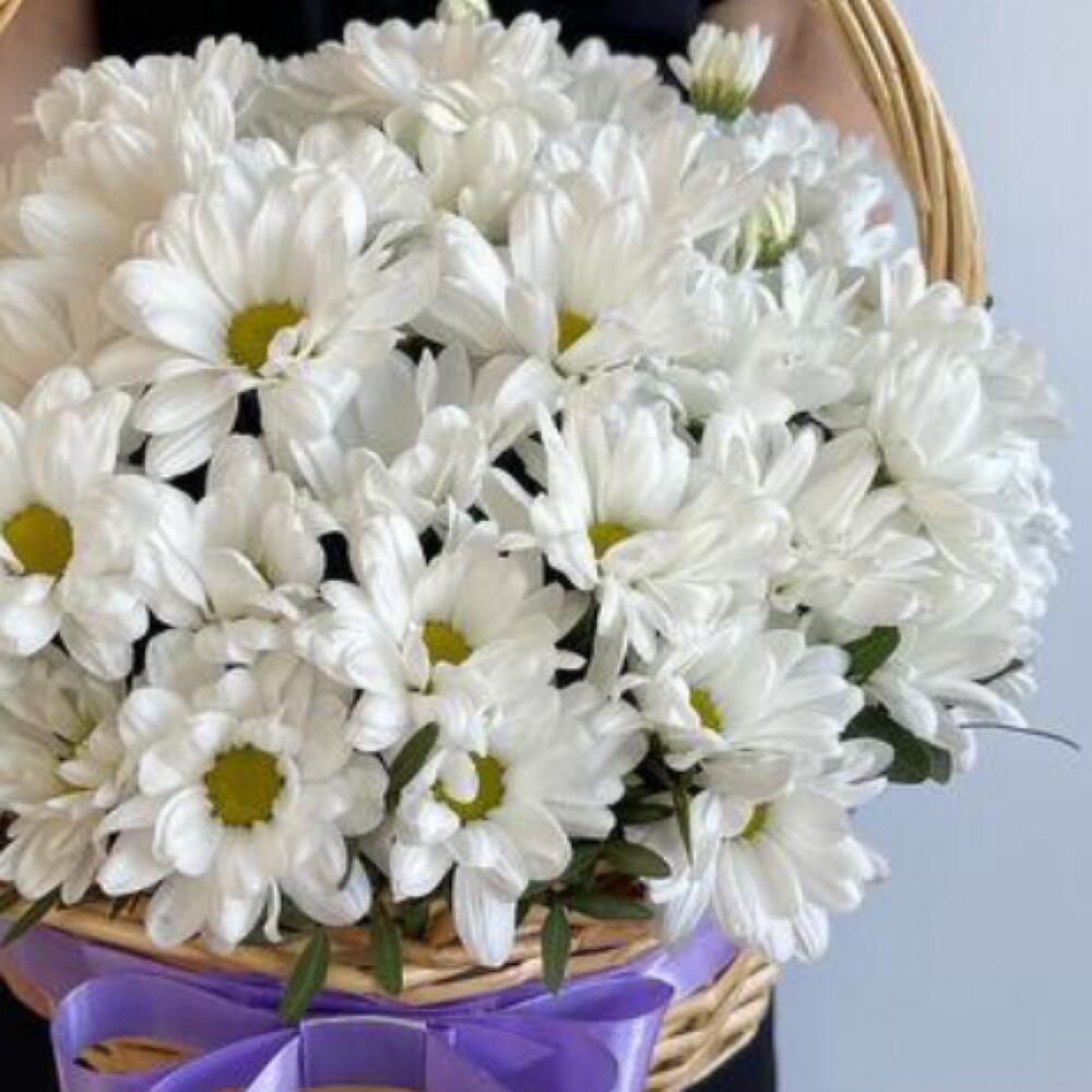 Хризантема кустовая – 9 шт.Фисташка – 3 шт.Корзина плетеная – 1 шт.бант атласный – 1 шт.