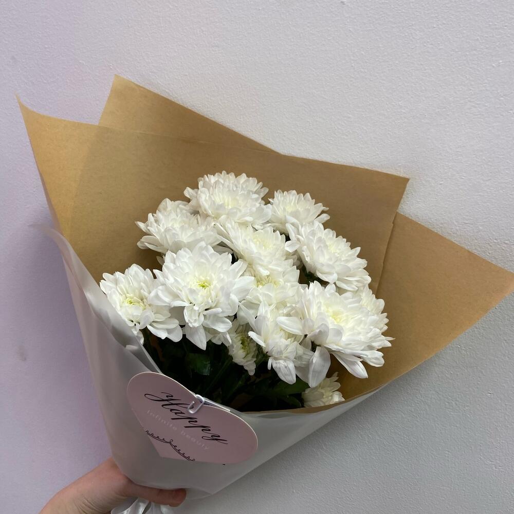 Хризантема кустовая – 3 шт.Упаковка крафт – 1 шт.Открыточка с вашими пожеланиями – 1 шт.Лента атласная – 1 шт.