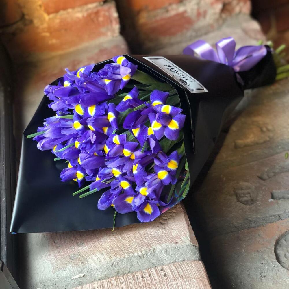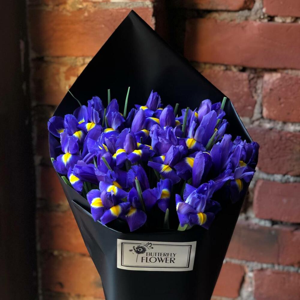Красивый, яркий букет из 19 ирисов в крафте "Армантьер"