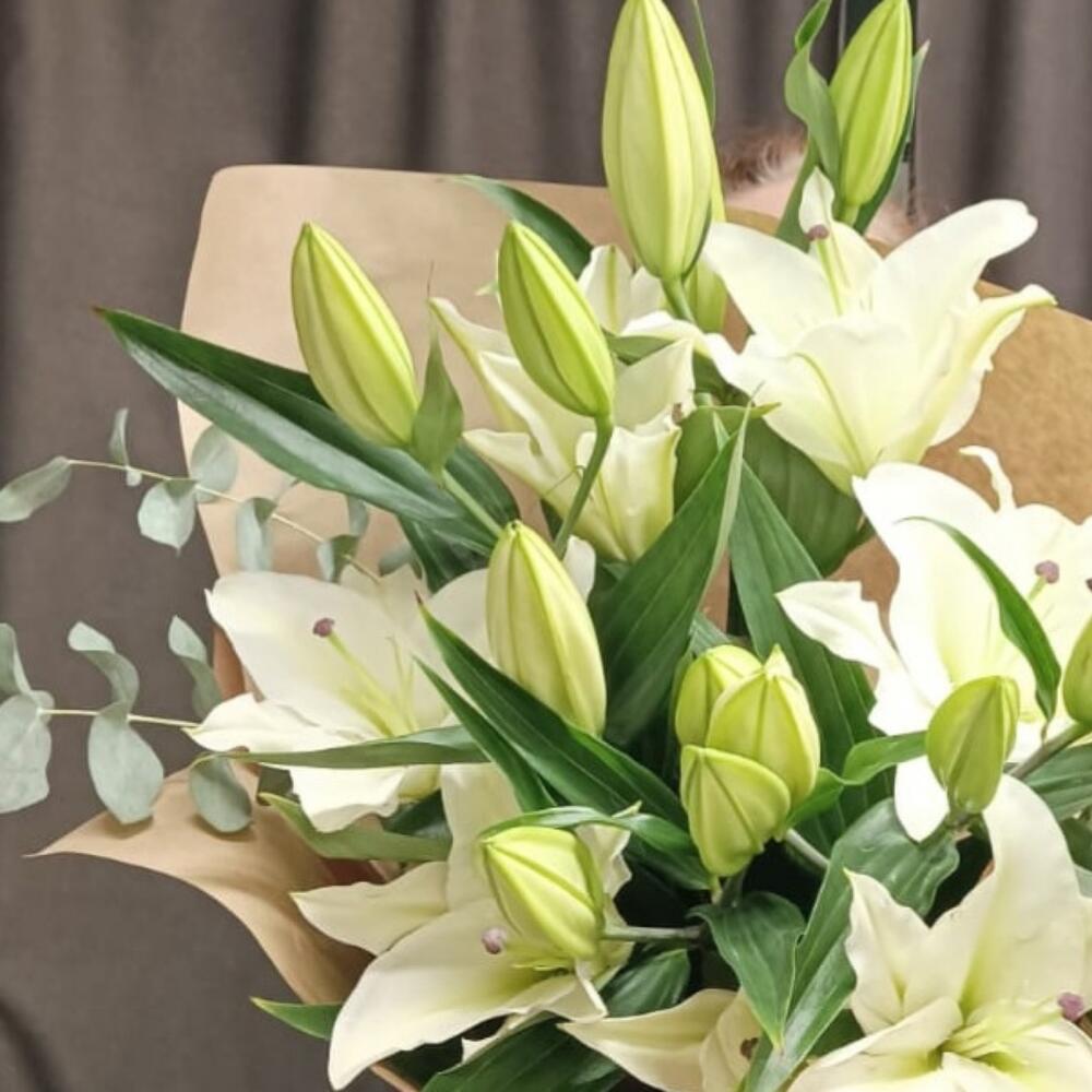 Лилия – 5 шт.Эвкалипт – 2 шт.Лента атласная – 2 шт.Упаковка дизайнерская – 2 шт.