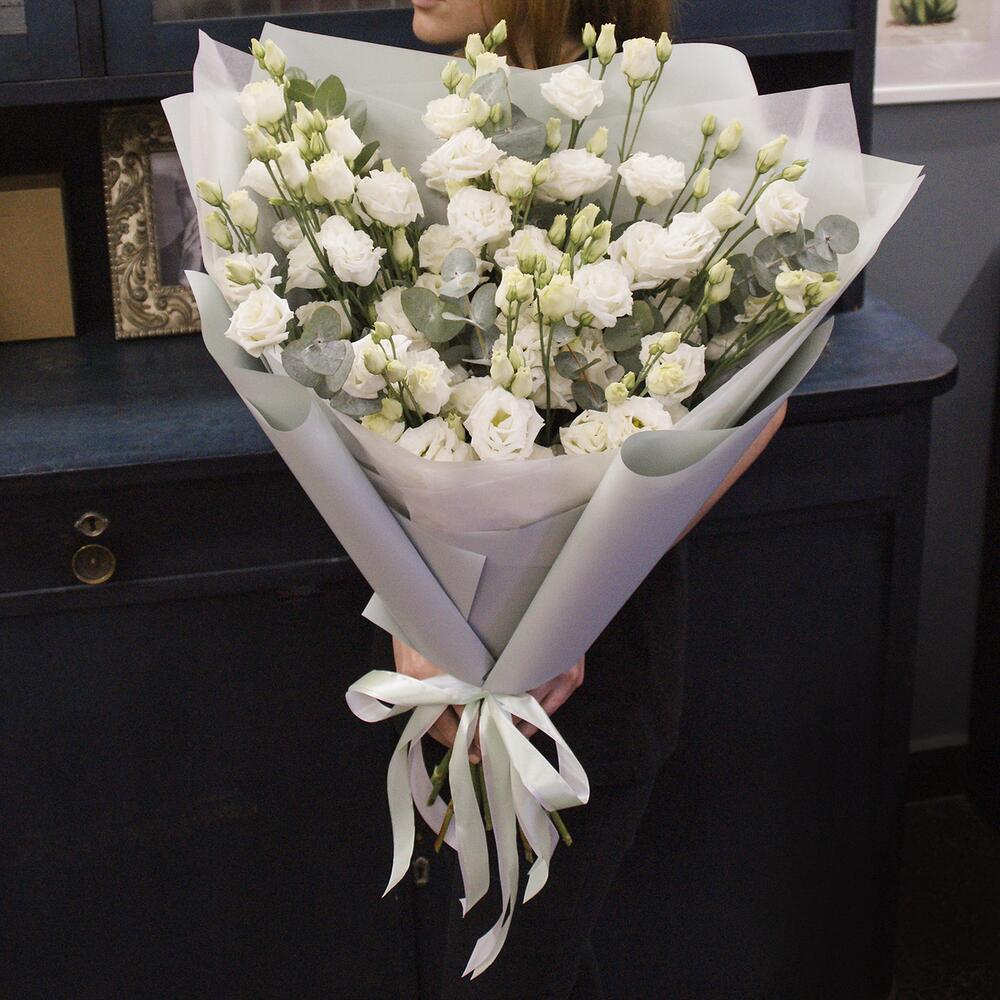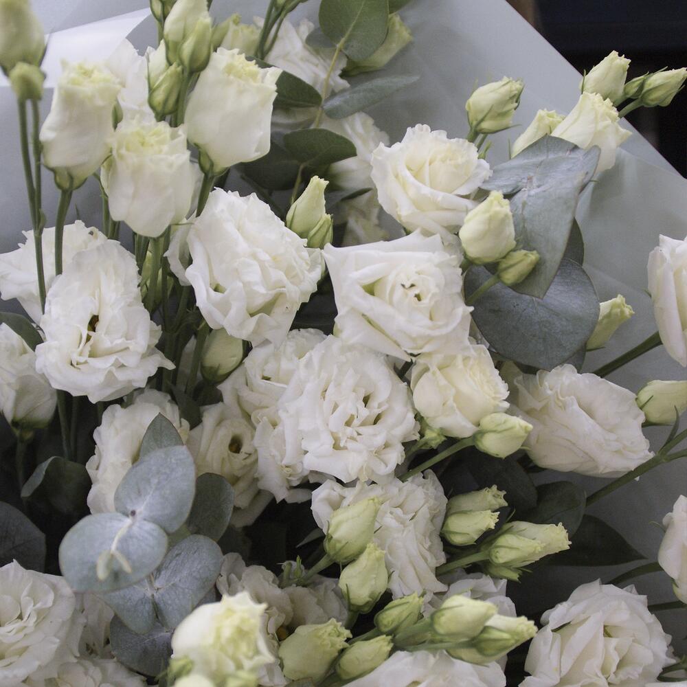 Большой букет из 19 эустом с эвкалиптом
