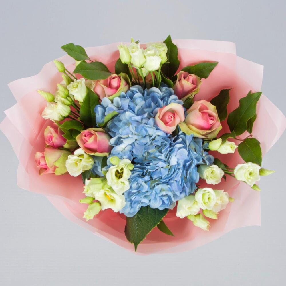 Гортензия – 1 шт. Эустома – 5 шт. троянда – 7 шт. Оформление – 1 шт.