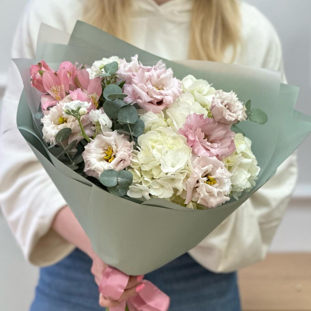 Альстромерия – 1 шт.Гортензия – 1 шт.Эвкалипт – 50 шт.Упаковка – 1 шт.эустома розовая – 2 шт.маттиола кустовая – 1 шт.