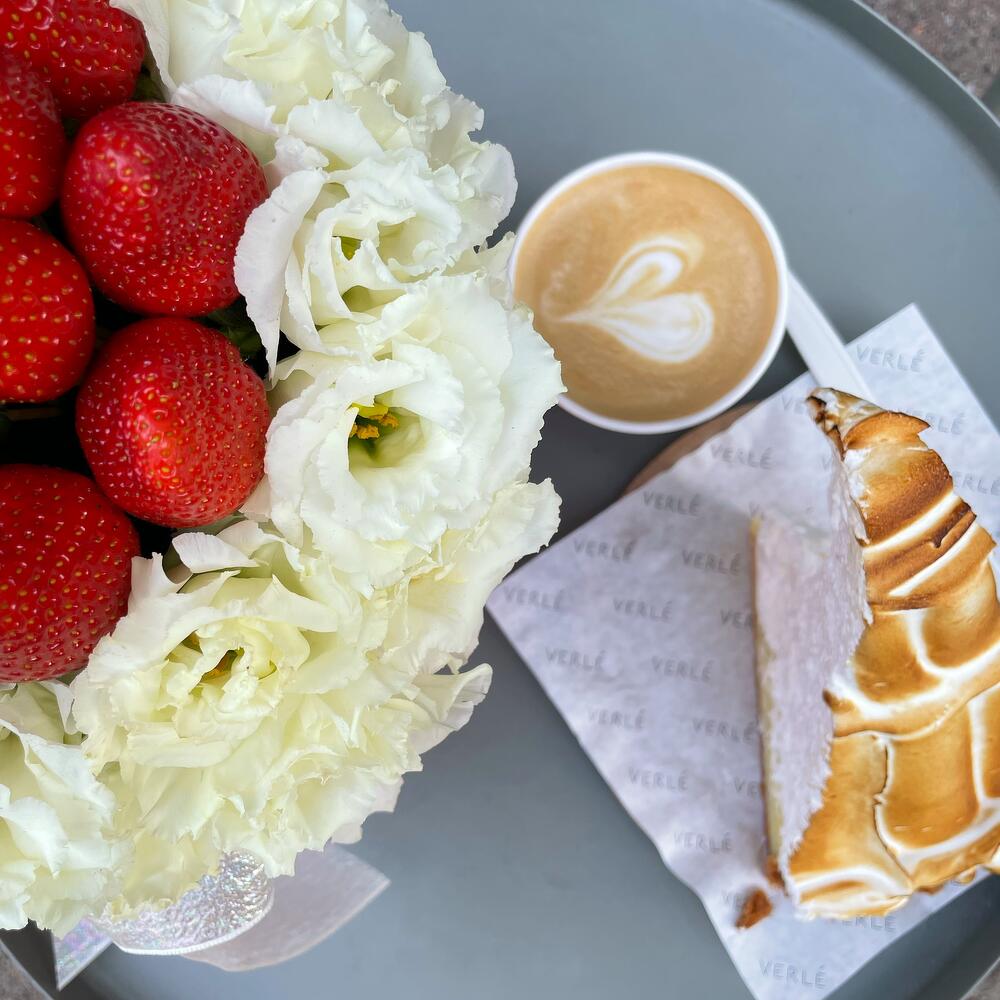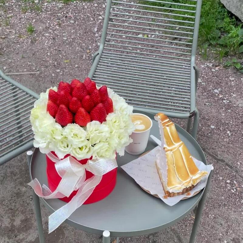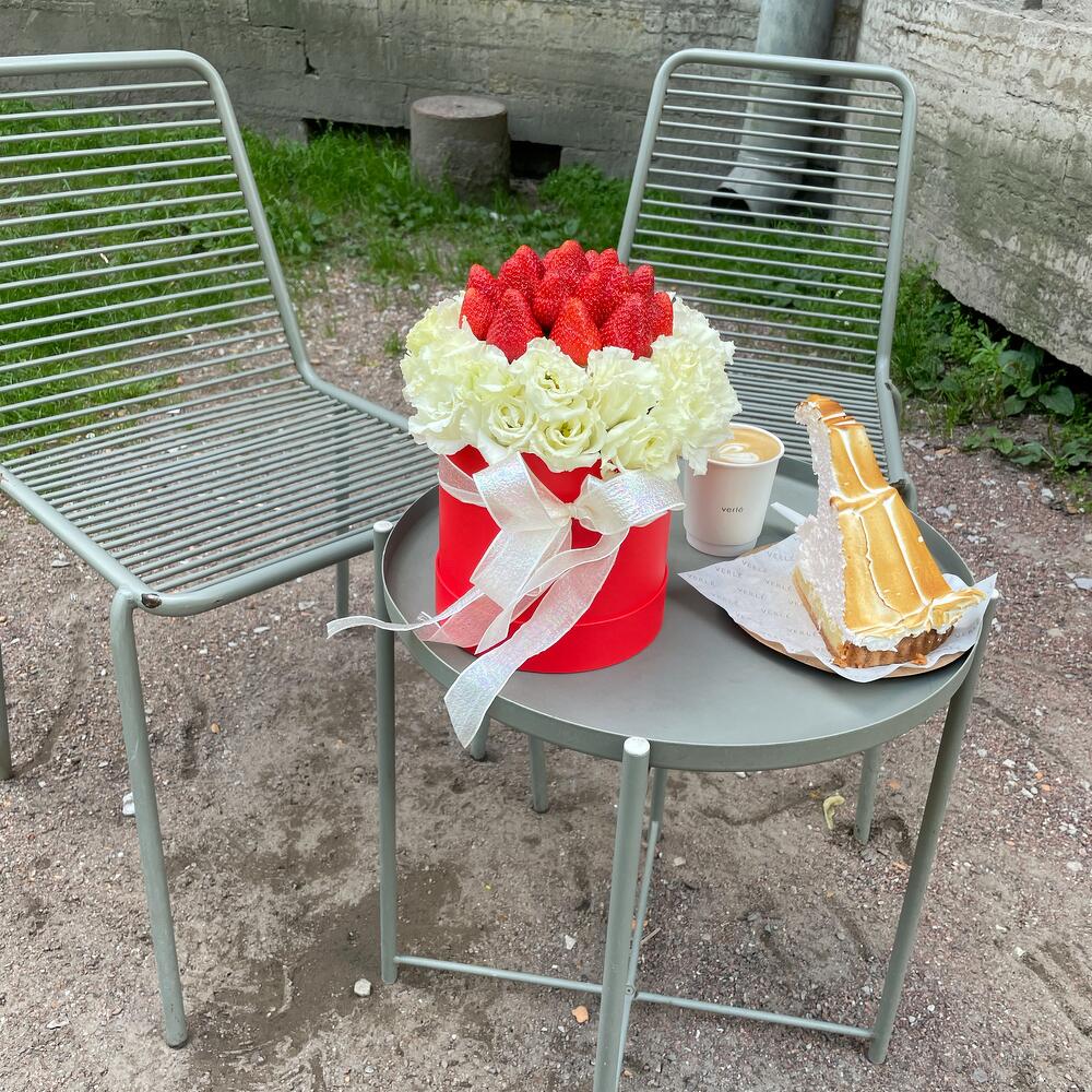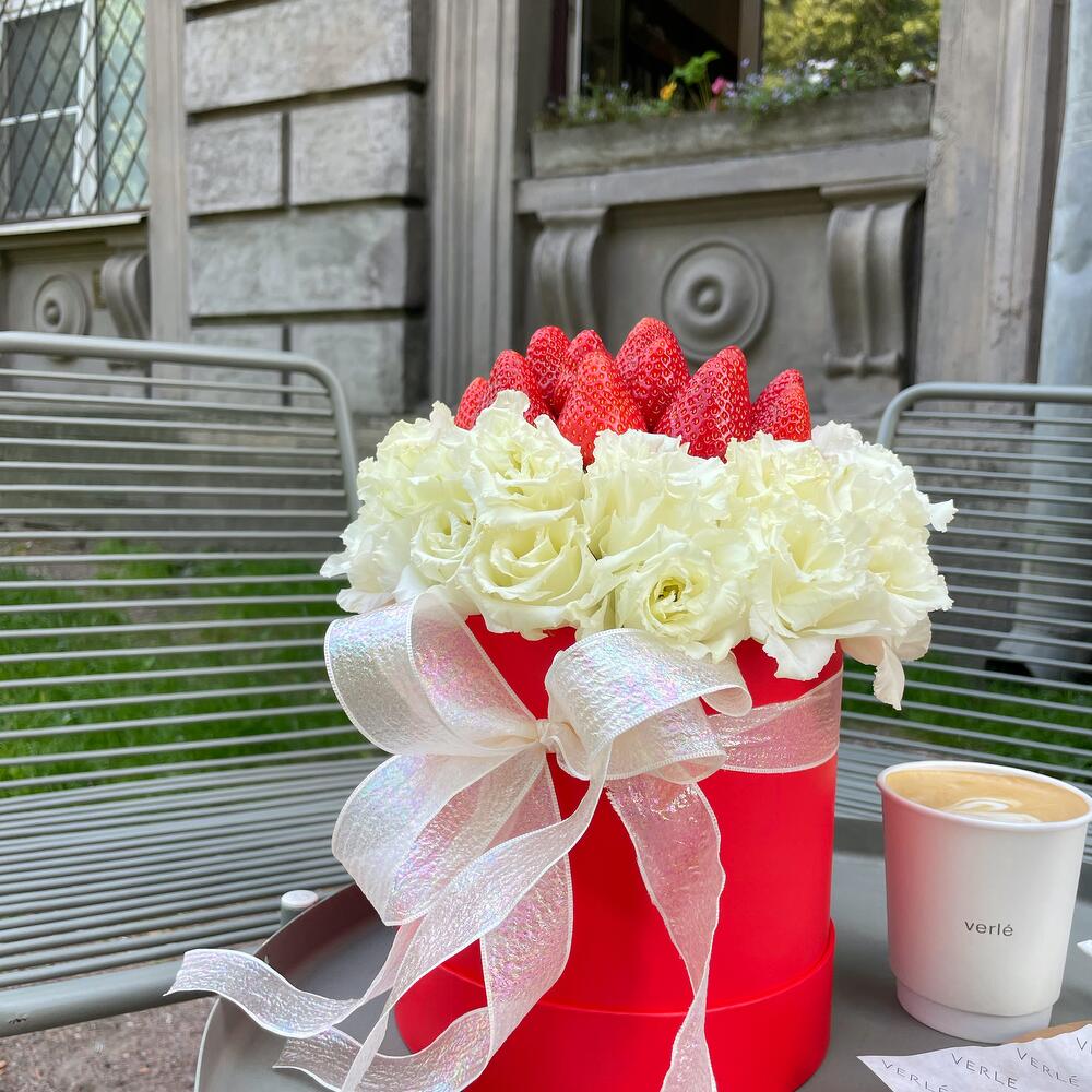 эустома белая – 5 шт.свежая клубника – 300 гр.