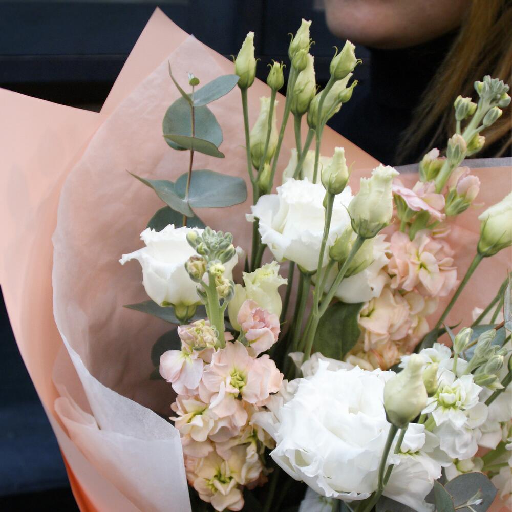 Лизиантус – 3 шт.Маттиола – 4 шт.Эвкалипт – 1 шт.Тишью – 1 шт.Атласная лента – 2 шт.Матовая пленка – 1 шт.