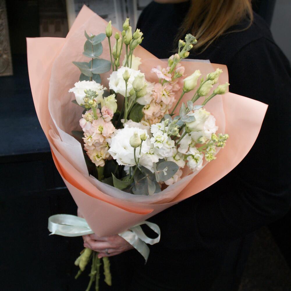 Букет из маттиолы и эустомы с добавлением ароматного эвкалипта