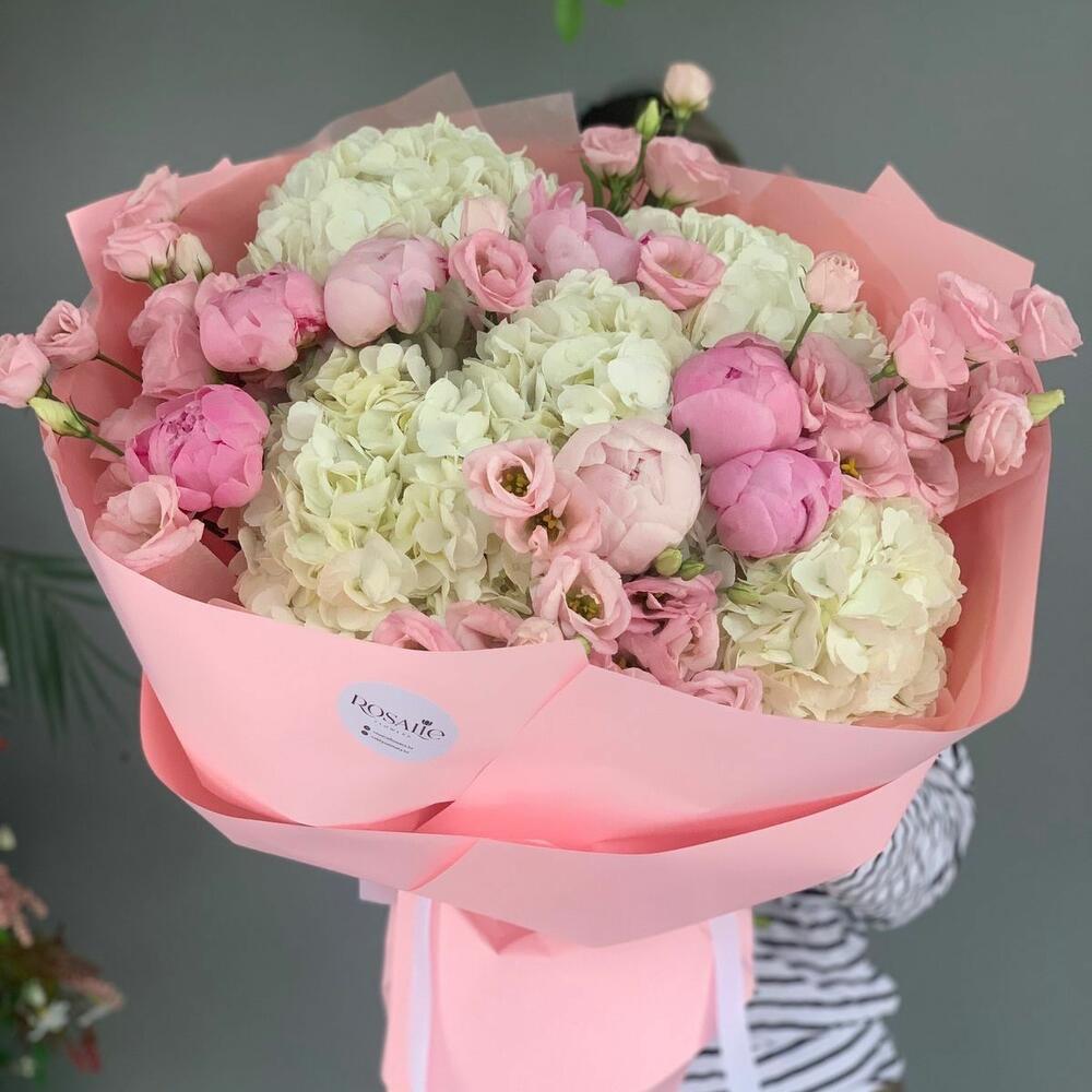 Авторский букет из розовых Гортензий и кустовых пионовидны Роз