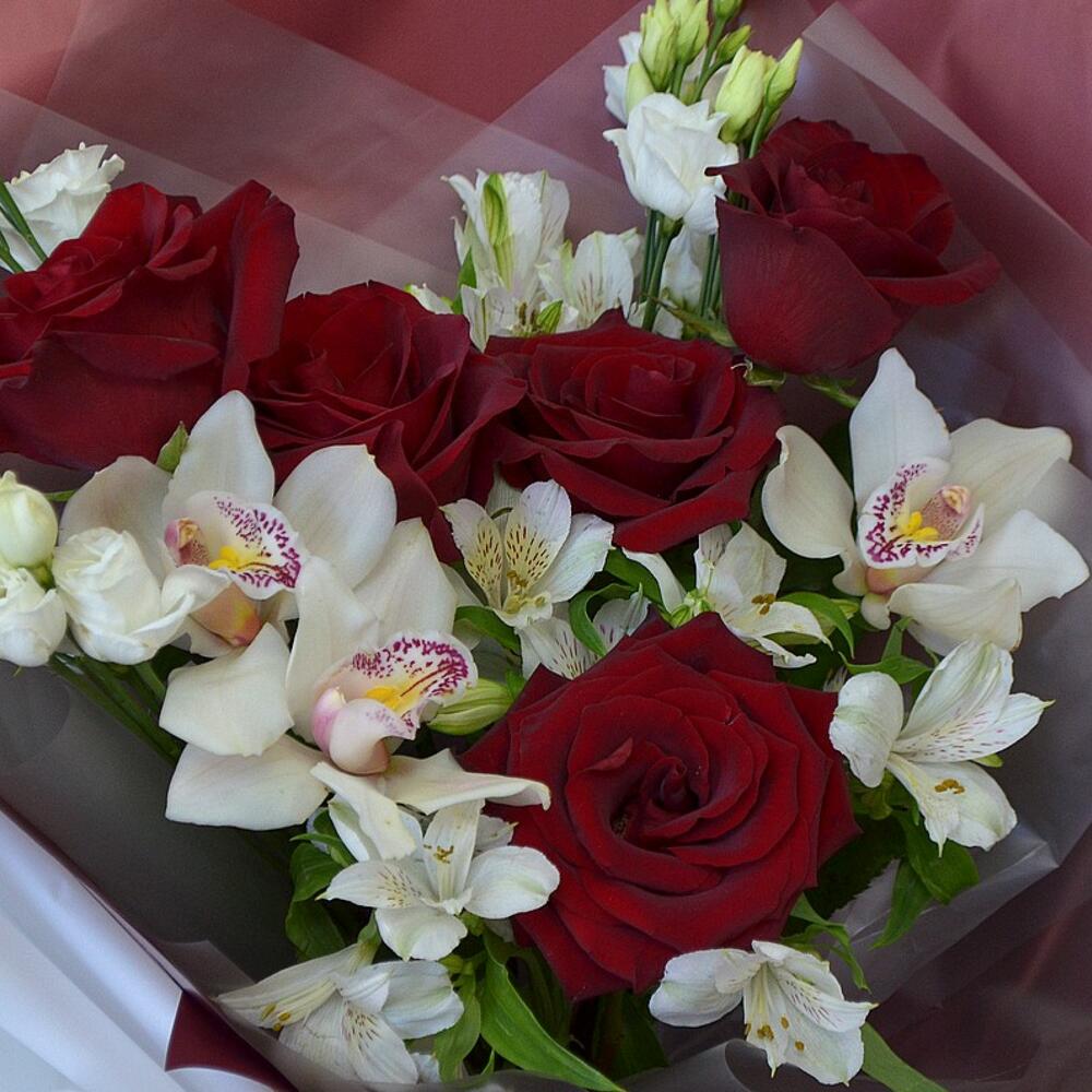 Орхидеи – 3 шт.розы экввадор – 5 шт.Эустома – 3 шт.Альстромерия – 5 шт.декоративная упаковка – 1 шт.