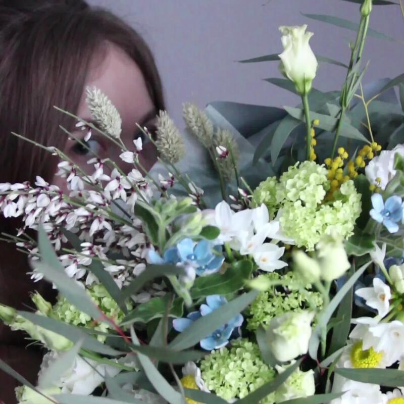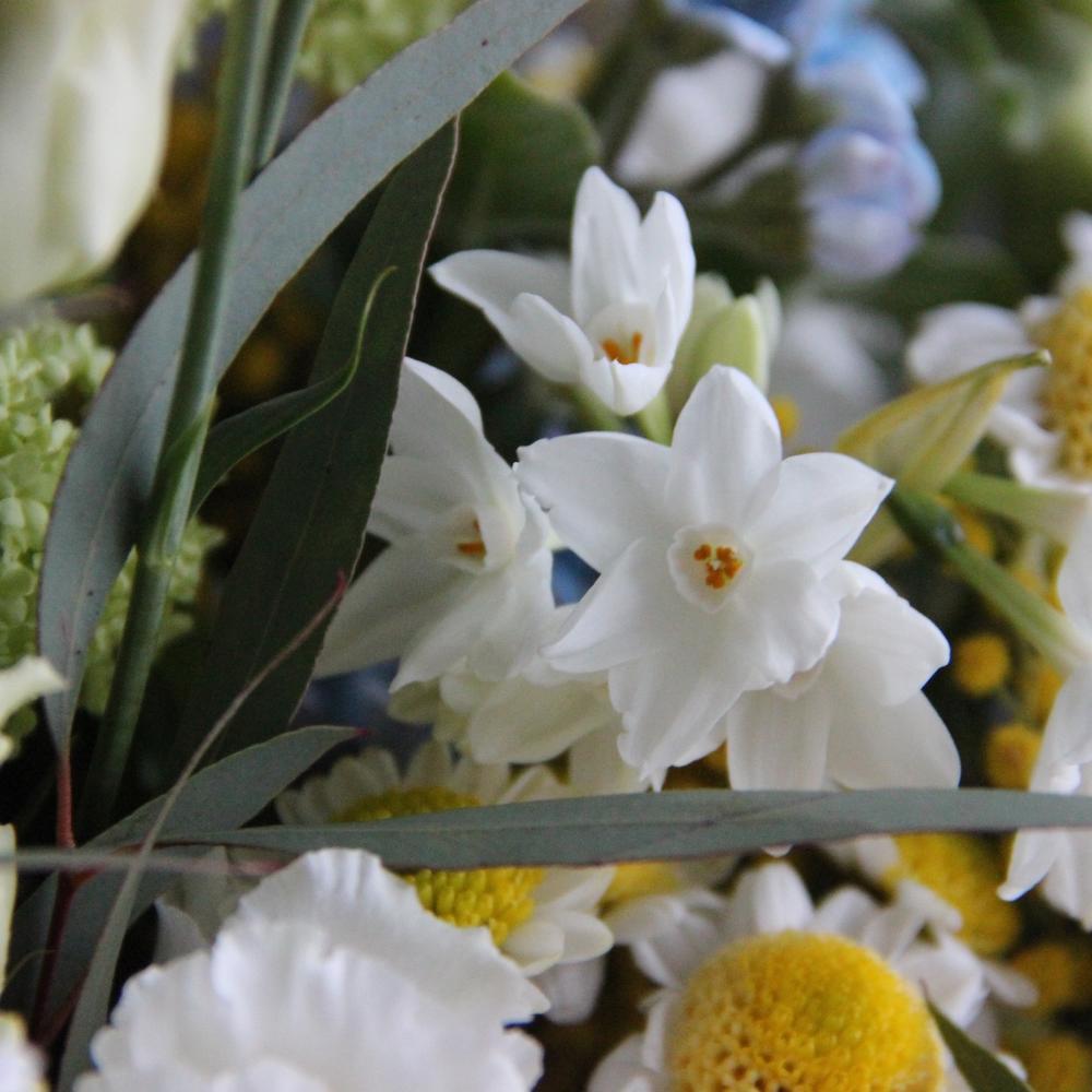 Душистый, весенний букет с мимозой, твидией, генистой, сантини, вибурнумом, канареечником и эвкалиптом.