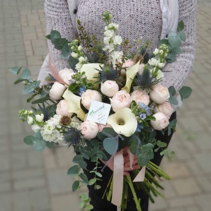 Букет растрепыш из калл, пионовидной розы и эрингиума