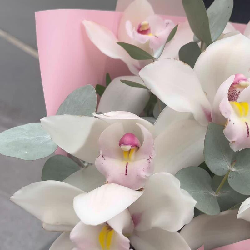 Лента атласная – 2 шт.удлинитель для орхидеи – 7 шт.Упаковка корейская пленка – 1 шт.премиум орхидея цимбидиум – 7 шт.