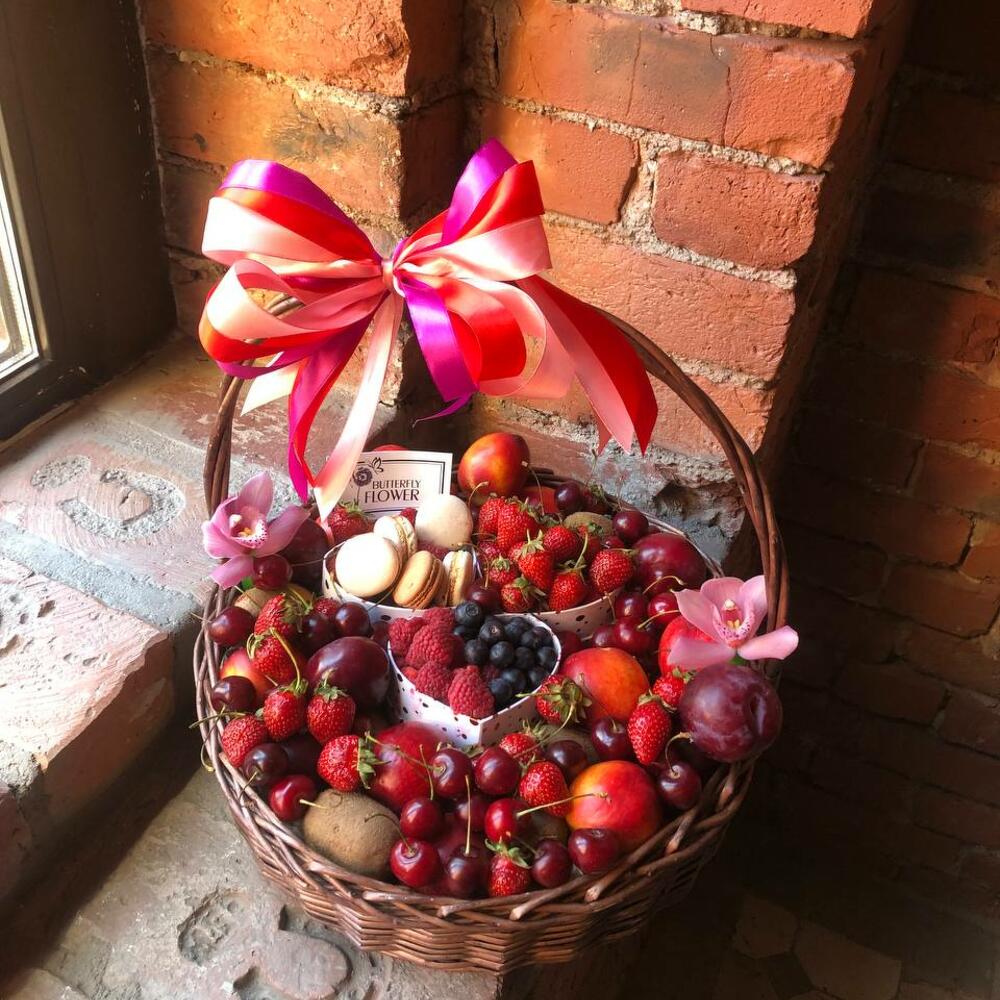 Подарочная корзина с фруктами, ягодами, пирожными и орхидеей “Ягодный микс”