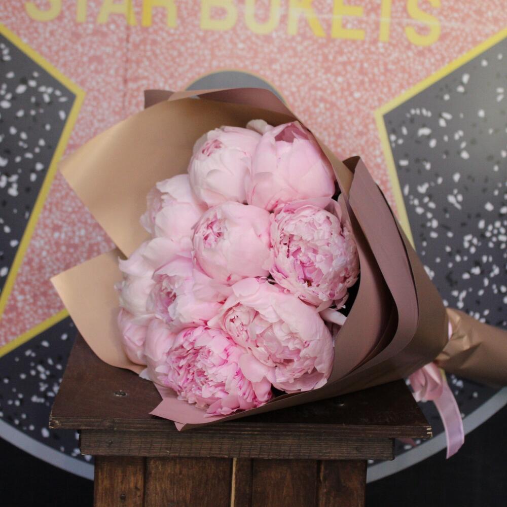 Лента атласная – 1 шт.Пион Сара Бернар – 11 шт.Пленка дизайнерская – 3 шт.