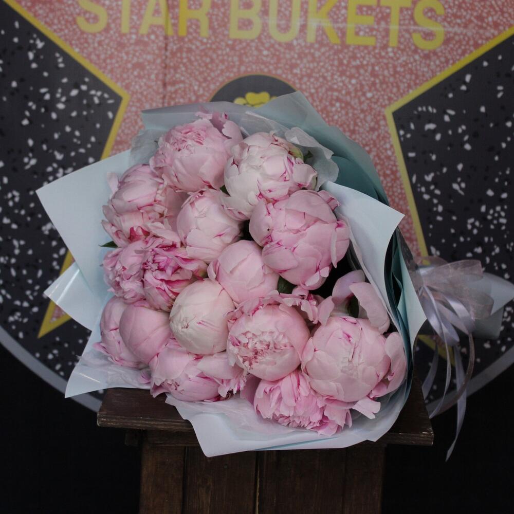Лента атласная – 1 шт.Тишью – 2 шт.Пион Сара Бернар – 15 шт.Пленка дизайнерская – 3 шт.
