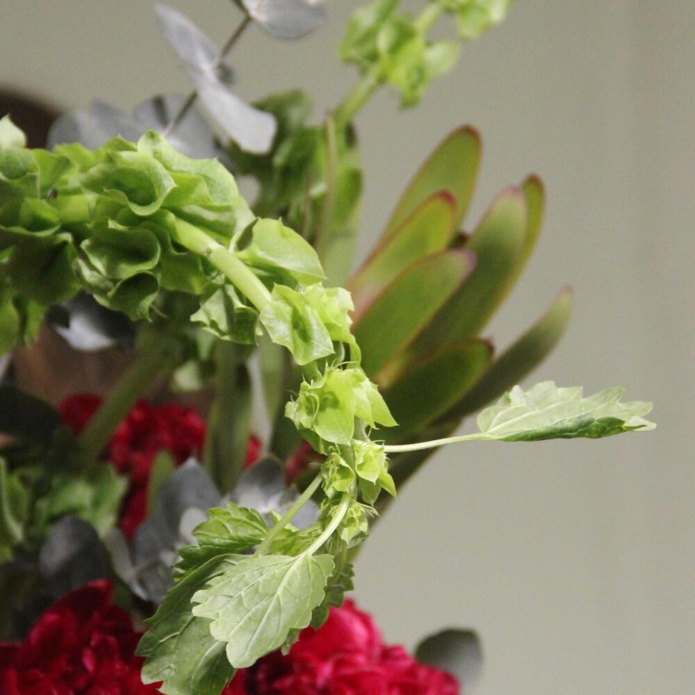 Лента – 1 шт.Пион – 9 шт.Эвкалипт – 7 шт.Орнитогалум – 2 шт.ирландский колокольчик – 2 шт.ветки аспарагуса – 3 шт.левкакендрон – 3 шт.
