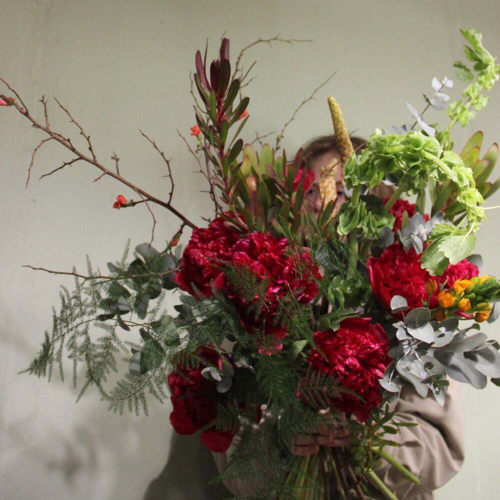 Алый – букет с пионами и ветвями