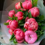 Букет из 11 коралловых пионов и декоративной зелени в дизайнерской упаковке “Корал Сенсейшен”