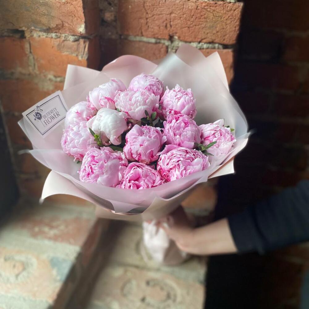 Букет из 13 розовых пионов с зеленью в дизайнерской упаковке “Принцесса Уэльская”