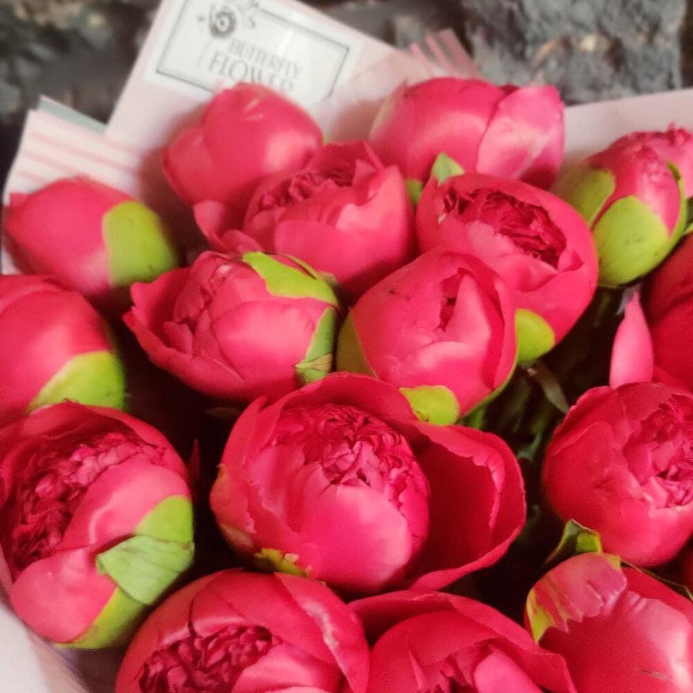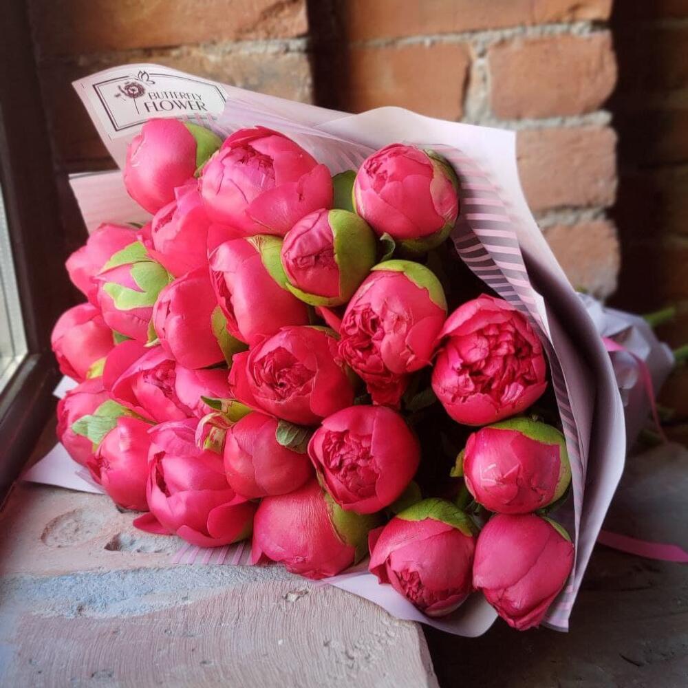 Букет из 23 ярко-розовых пионов в дизайнерской упаковке “Сьюзи Кью”