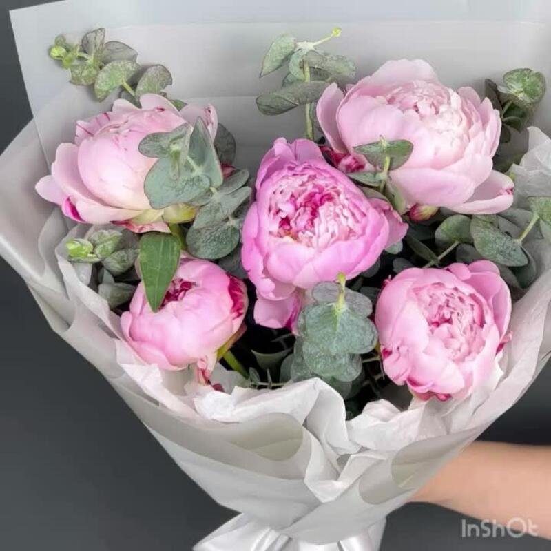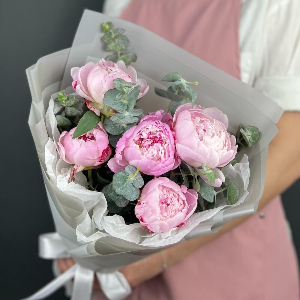 Эвкалипт – 5 шт.Лента атласная – 1 шт.Пион Сара Бернар – 5 шт.Бумага тишью – 1 шт.бумага дизайнерская – 5 шт.