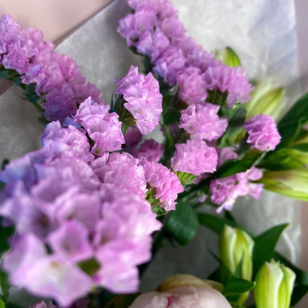 Упаковка – 1 шт.Альстромерия белая – 3 шт.Пион розовый – 3 шт.Статица розовая – 1 шт.