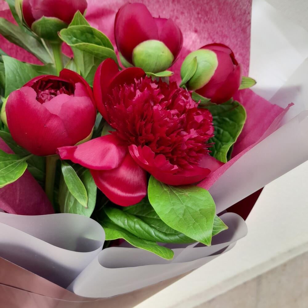 Пион – 5 шт.Лента атласная – 2 шт.Упаковка дизайнерская – 3 шт.
