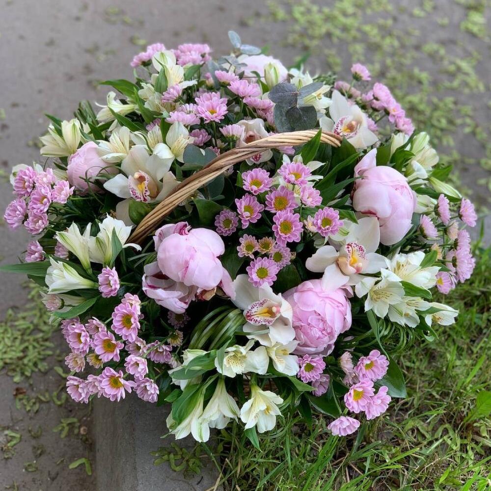 Пион Сара Бернар – 5 шт.Альстромерия – 10 шт.Сантини – 8 шт.Эвкалипт – 3 шт.Зелень – 5 шт.Корзина – 1 шт.