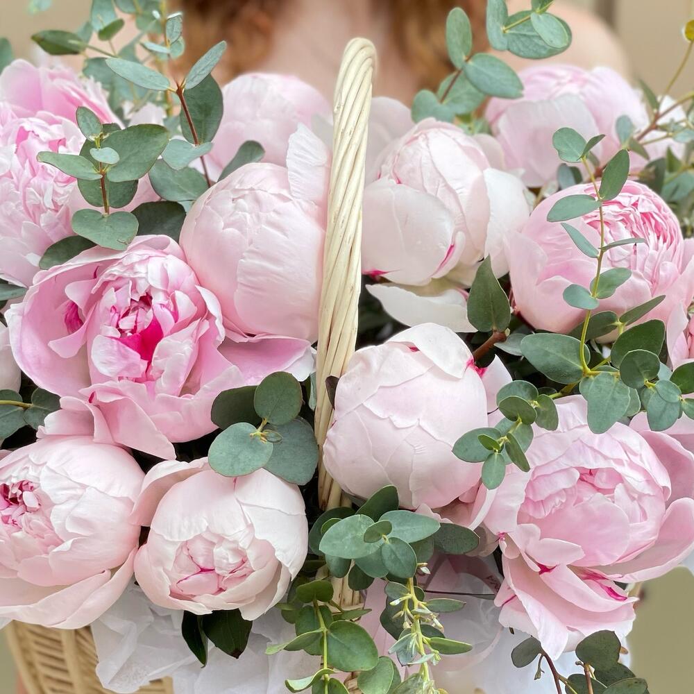 Пион Сара Бернар розовый – 19 шт.Корзина плетеная – 1 шт.Эвкалипт пучок – 2 шт.Лента брендированная – 1 шт.Оазис флористический – 2 шт.Тишью белое – 4 шт.лента силиконовая брендированная – 1 шт.