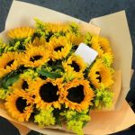 Подсолнух – 15 шт.Упаковка дизайнерская – 1 шт.Лента атласная – 1 шт.Открытка – 1 шт.инструкция по уходу за цветами – 1 шт.хорошее настроение – 1 шт.Кризал – 1 шт.коробка переноска – 1 шт.Мимоза – 10 шт.