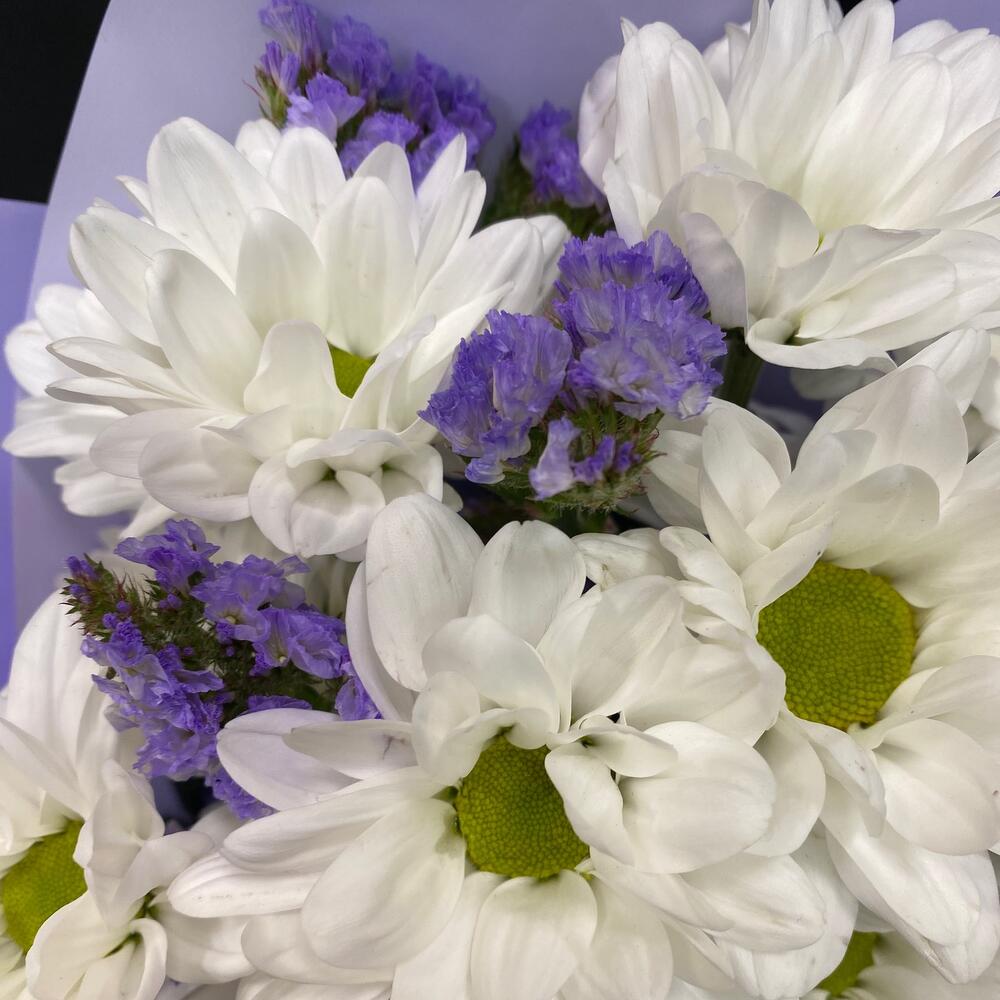 Статица – 3 шт.Упаковка – 1 шт.Лента атласная – 1 шт.Ромашка кустовая – 5 шт.