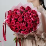 роза кустовая пионовидная роял трендсеттер – 15 шт.Дизайнерская упаковка – 4 шт.Лента атласная – 1 шт.