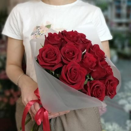 Стильный монобукет из 25 красных роз с оформлением – это классика, которая будет по нраву каждой девушке.