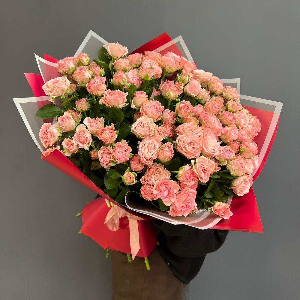 Атласная лента – 1 шт.Пионовидная кустовая роза – 29 шт.Дизайнерская упаковка – 1 шт.