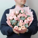 Эвкалипт – 4 шт.Лента атласная – 1 шт.Упаковка дизайнерская – 4 шт.роза кустовая пионовидная мэнсфилд парк – 7 шт.
