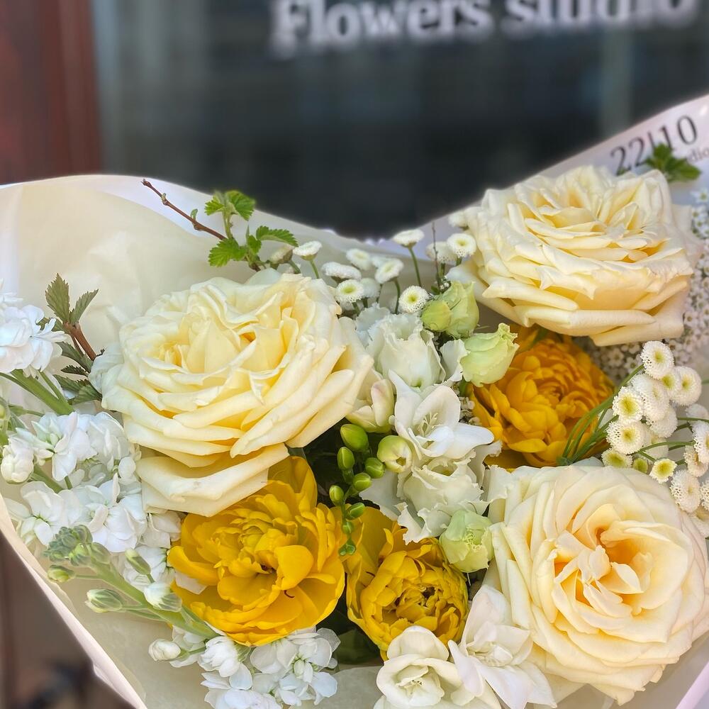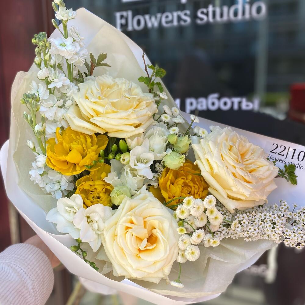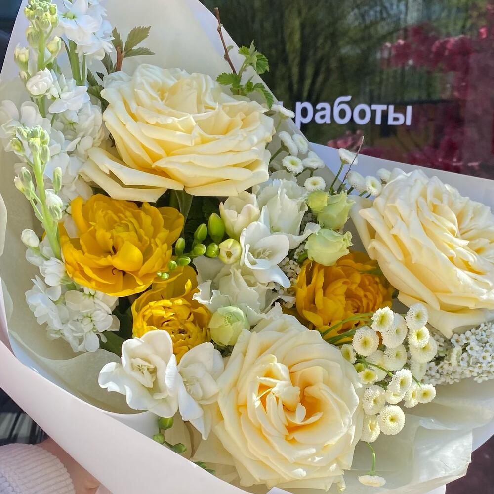 кэндллайт роза – 3 шт.Маттиола – 3 шт.Фрезия – 2 шт.эустома алиса вайт – 1 шт.матрикарья – 2 шт.Тюльпан пионовидный – 3 шт.ветви малины – 3 шт.спирея ветка – 2 шт.Упаковка дизайнерская – 3 шт.Лента атласная – 1 шт.