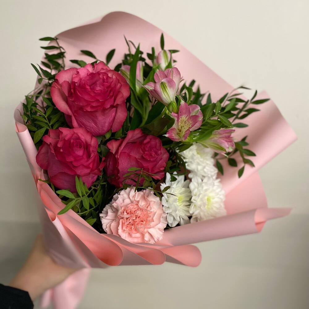 Альстромерия – 1 шт.Хризантема кустовая – 1 шт.Роза – 3 шт.Зелень – 3 шт.Упаковка – 3 шт.Гвоздика – 1 шт.