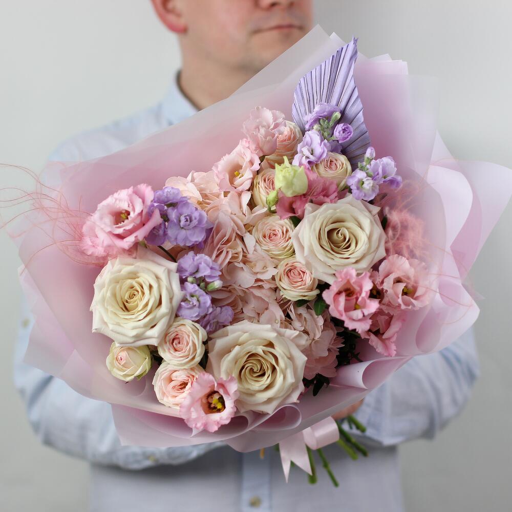 Гортензия – 1 шт.Маттиола – 3 шт.Писташ – 4 шт.Лента атласная – 1 шт.Роза кустовая пионовидная – 2 шт.Упаковка дизайнерская – 4 шт.эустома розовая – 3 шт.Стифа – 2 шт.Роза мента 50 см – 3 шт.пика пальма – 1 шт.