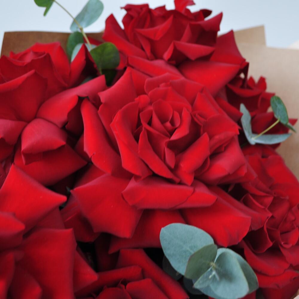 Эвкалипт – 1 шт.Лента атласная – 1 шт.Крафт – 1 шт.Роза французская – 7 шт.Крафт жатый – 1 шт.