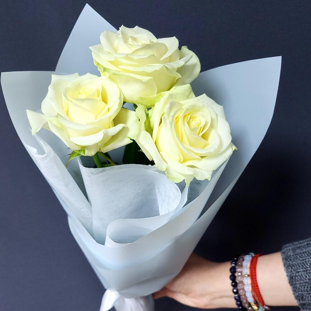 белые розы 50 см – 3 шт.Крафт упаковка – 1 шт.Лента атласная – 1 шт.